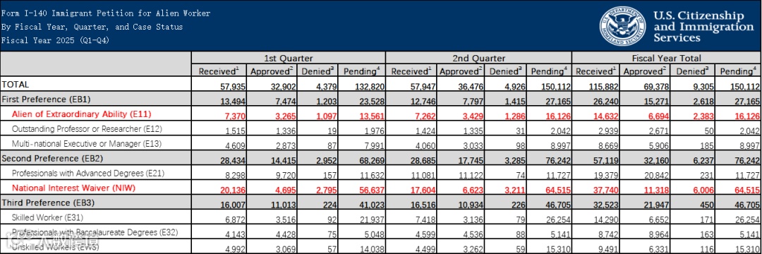 相较2025财年第一季度,第二季度EB-1A获批率下跌约2.12%,NIW获批率上涨约4.67%。整体来看,2025财年第一季度与第二季度,EB-1A和NIW的整体获批率变动不大。
