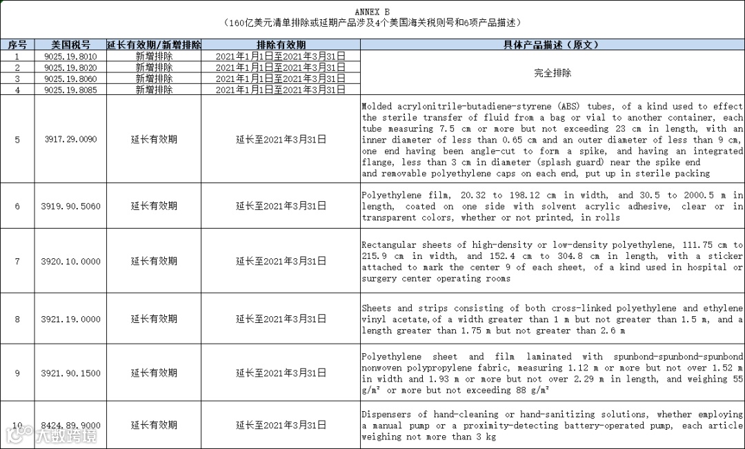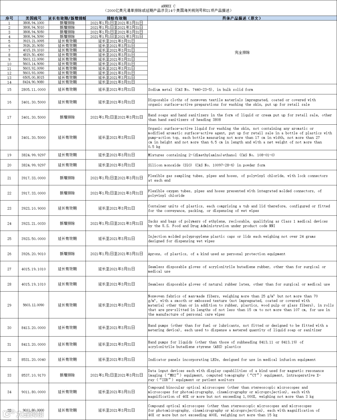 USTR在会同美国卫生部(Department of Health and Human Services,“HHS”)协商后,在产品排除审查程序中,对于下述4项清单中涉及应对新冠疫情的医药用品做优先审查。这些排除产品包括个人防护设备和其他用于医疗使用的相关产品。