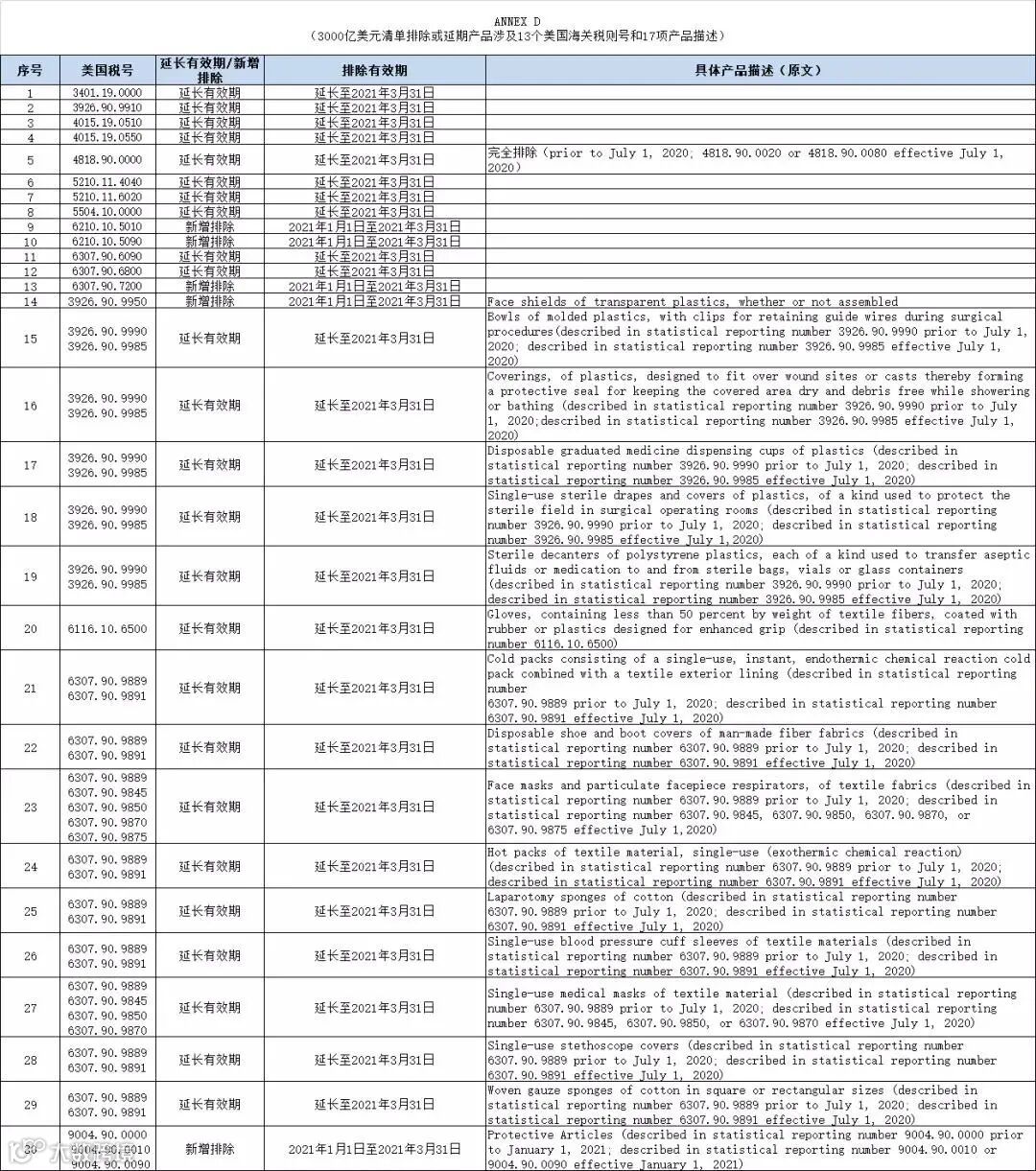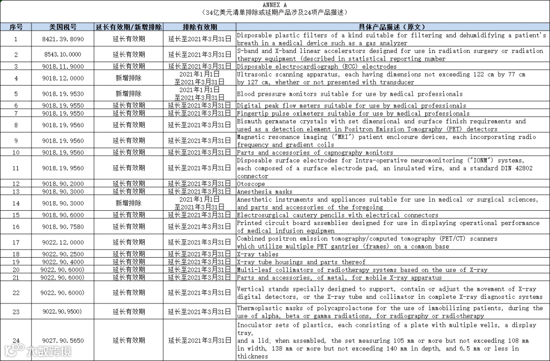 12月22日,美国贸易代表办公室(USTR)发布公告,公布了四批医用产品排除加征有效期延长清单。USTR在公告中称,为应对新冠肺炎疫情,美国决定对四批医疗防护产品的加征关税排除有效期进行延长,共涉及99项医疗防护产品(包含部分新增排除产品),被延期排除的产品排除有效期将从目前的2020年12月31日,延长至2021年3月31日。新的排除产品有效期将从2021年1月1日起生效至2021年3月31日止。