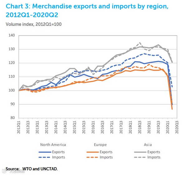 根据WTO的数据,全球商品贸易在2020年的第二季度出现了有史以来最大的单季度跌幅,与前一季度相比下降了14.3%。降幅最大的是欧洲和北美,出口分别下降了24.5%和21.8%。相比之下,亚洲出口相对未受影响,仅下降了6.1%。同期,北美和欧洲的进口额分别下降了14.5%和19.3%,而亚洲的进口额仅下降了7.1%。
