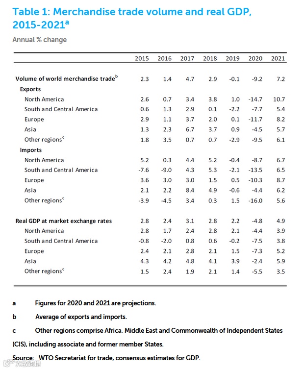 从WTO统计的《表1:2015-2021年商品贸易额与实际GDP》显示(其中2020年和2021年的数据为预测),预计2021年所有地区的进出口总额都将大幅增长,商品贸易会出现约7.2%的增长。但这也意味着,中国出口“一枝独秀”局面可能被打破。