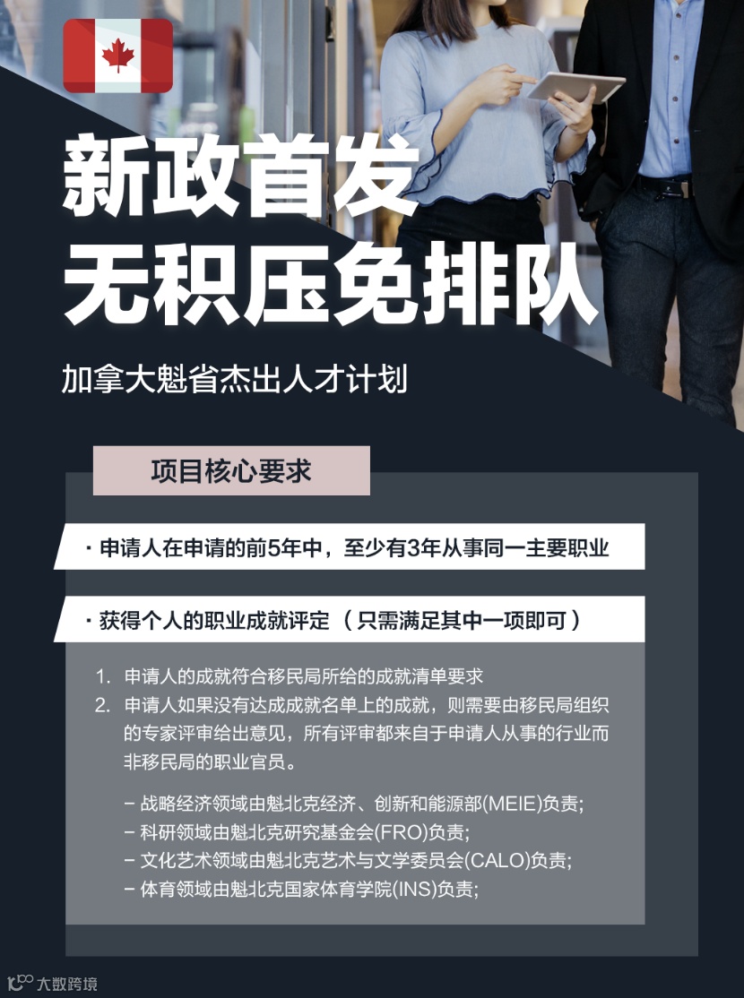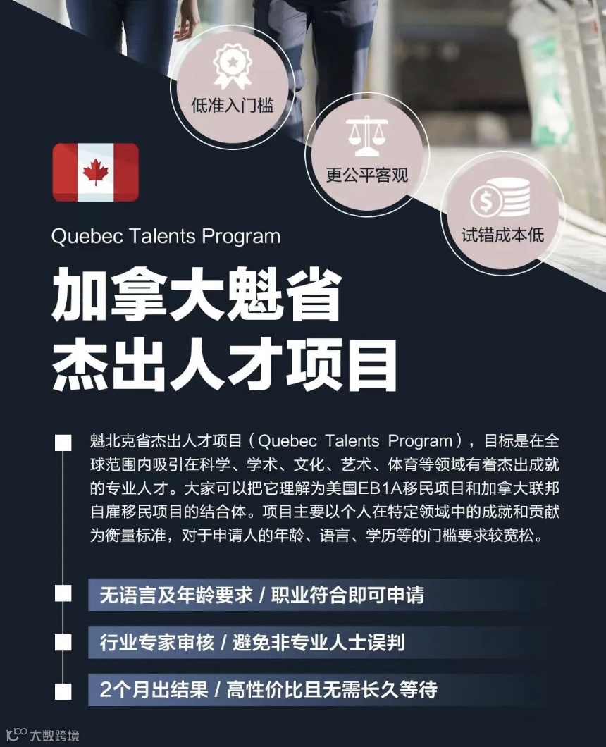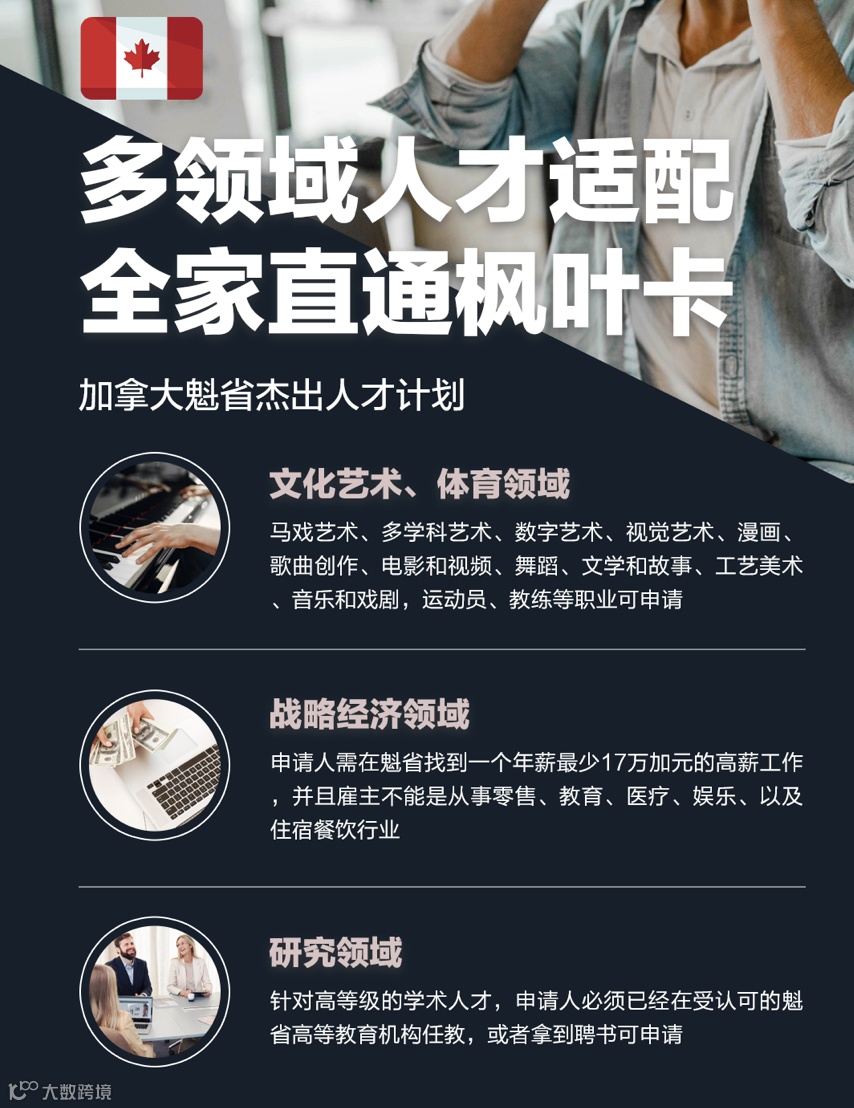 魁北克省推出全新【杰出人才项目(Quebec Talents Program)】,对比传统移民项目,它几乎是“开挂”的存在——不打分、不看语言、也不限年龄学历,简直是加拿大移民政策中的“天花板”!