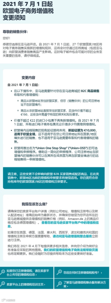 目前,不少跨境电商卖家已收到了亚马逊发来的《2021年7月1日起欧盟电子商务增值税变更须知》邮件,自2021年7月1日起,亚马逊将对27个欧盟国家/地区的电子商务销售实施新的增值税规则,这会对卖家通过亚马逊等在线商城向欧盟消费者销售商品产生影响。具体内容如下:
