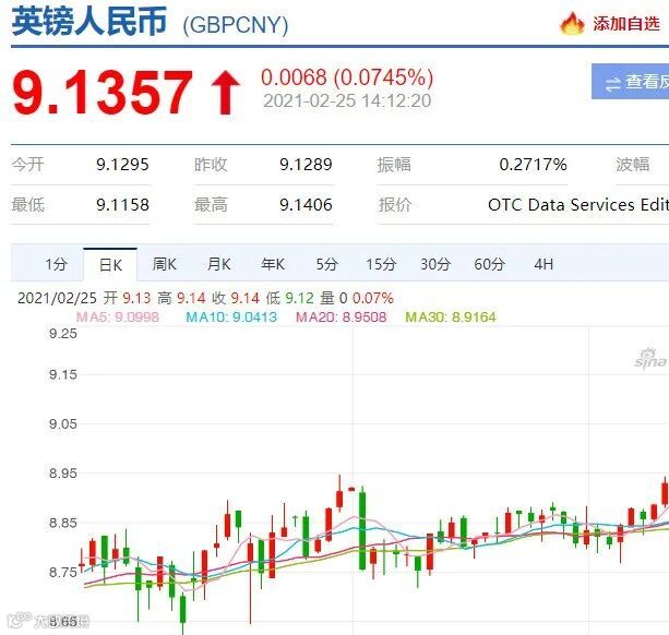 英镑兑人民币汇率也涨破9.1,创下近3个月新高。