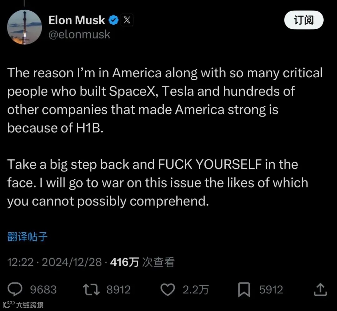 他表示 “我之所以在美国,同这么多创建了 SpaceX、特斯拉和其他数百家让美国变得强大的公司的关键人物在一起,就是因为H-1B签证。我将在这个问题上‘开战’。”