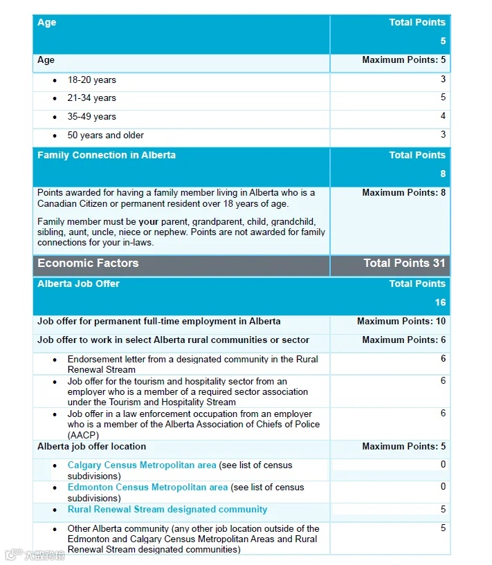 每个候选人根据其教育背景、工作经验、语言能力、年龄、阿尔伯塔省的亲属关系等因素获得相应的分数。