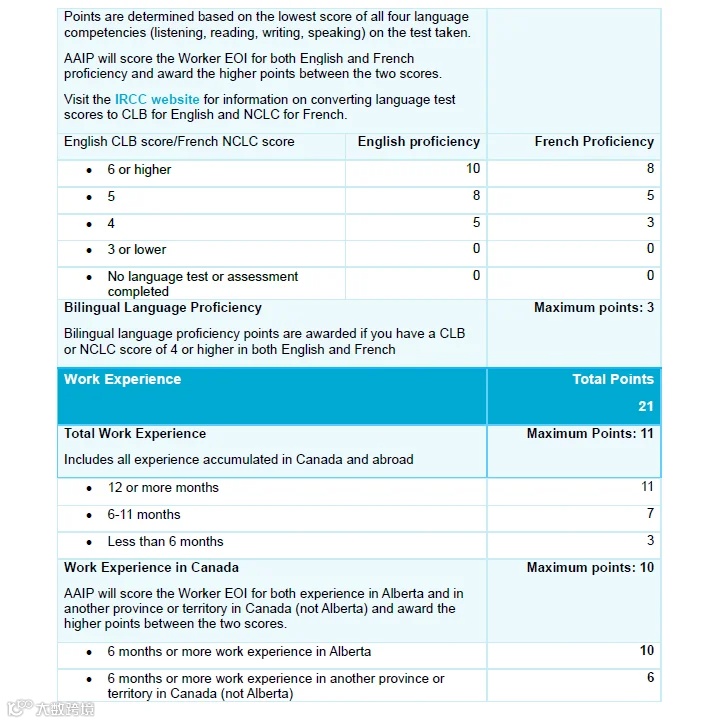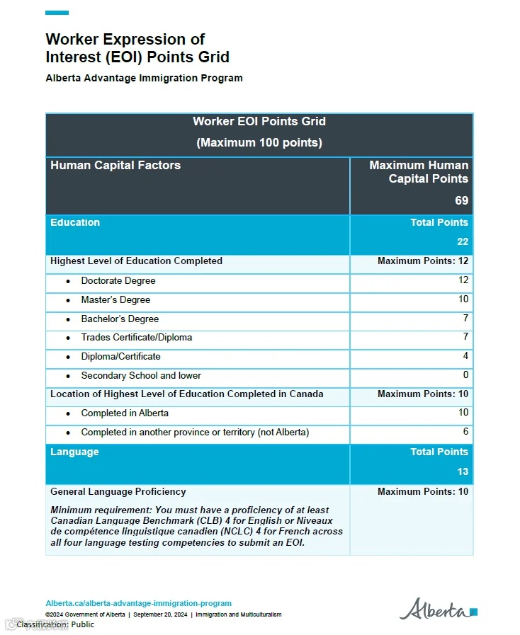 9月23号阿省在其官网上公布了新的阿省省提名EOI打分细则。工人类别EOI系统的评分由人力资本因素和经济因素两部分组成,最高分数100分。