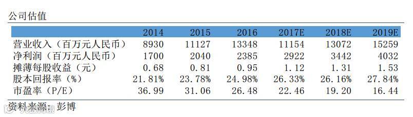 受惠于旗下品牌的强劲销售表现及收入结构的持续优化,安踏体育的市场份额和盈利能力不断取得突破,行业龙头的竞争优势更趋明显。从公司的PE/PB-Band上看,公司过去3年的PE区间在14.6-26.4倍,PB区间为3.5-6.5倍。目前股价对应彭博预测2017年PE和PB分别为22.46倍和5.12倍。