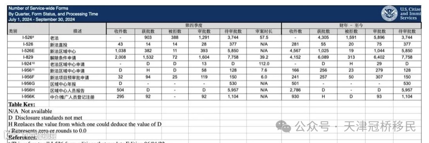 表中可见,24财年的第四季度(2024年7-9月),新政区域中心I-526E的递件数为1038份,43份直投I-526,合计1081份,平均每个月是360份申请。
