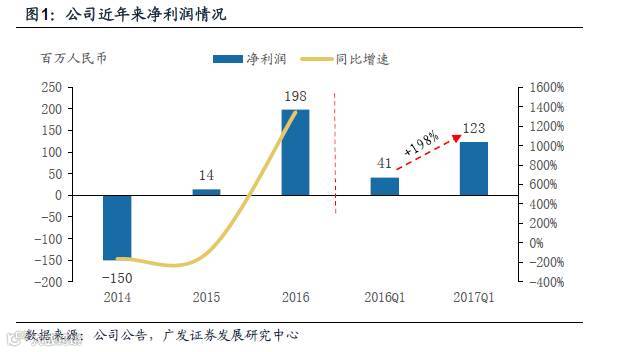 2017年一季度公司实现主营业务收入人民币15.86亿元,同比增长10.49%,实现净利润人民币1.23亿元,同比增长198%,增速超出预期,净利润增速与主营业务收入增速相差较大主要是由于公司一季度获得政府补助3600万元,相比去年同期的250万元增长了13倍之多,以及公司一季度投资收益同比增长156.8%。