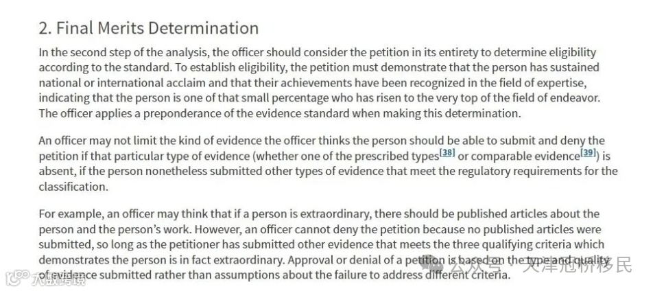 依据EB1A移民指导手册,一旦申请人满足初步门槛,移民审案官将行使“自由裁量权”,对申请人的综合情况作出“最终价值评估”,核心在于评估其赴美后能否持续在专长领域内为美国带来实际利益。