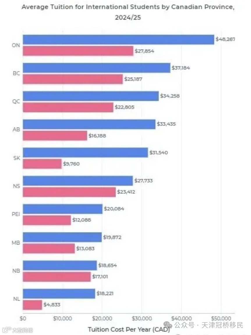 相较之下,研究生学费方面,不列颠哥伦比亚省、新斯科舍省和安大略省均高于全国平均水平,而萨斯喀彻温省和纽芬兰与拉布拉多省的研究生学费则低于10,000加元,成为经济实惠的选择。