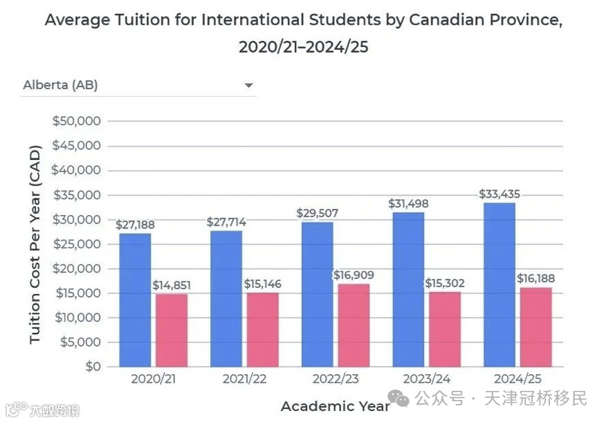 根据统计,2024/25学年国际学生的本科平均学费已突破40,000加元,比前一年增长了5%。虽然增幅不大,但这仍是自2021/22学年以来的最低年增幅。同时,研究生学费也上涨了5%,创下五年来最大增幅,但相比本科学费依然显著较低。