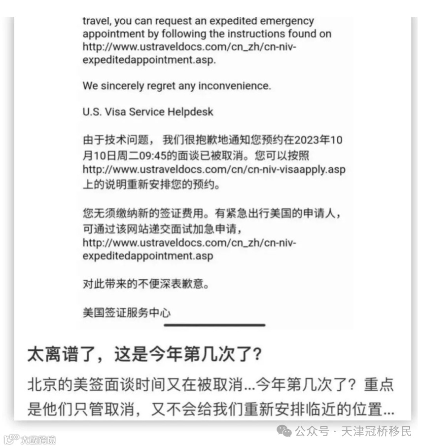 2023年9月至10月,大量中国赴美国的B类签证面谈突然被取消。