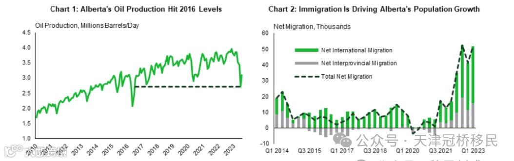 尽管今年早些时候的严重野火和一般维护停工导致石油行业活动暂时减少,但阿省在 2023 年仍将在全省 GDP 增长中保持领先地位。第二季度石油产量下降15%,达到2016年以来的最低水平。然而,尽管跨山管道的启动延迟,预计秋季产量的快速恢复将提振2024年石油产量的增长。