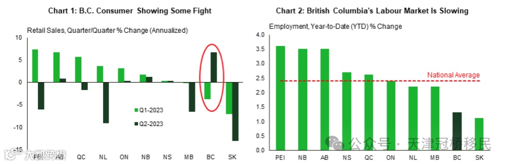 BC省的劳动力市场明显减速。1-8月,就业增速同比放缓至仅1.3%,低于全国平均水平。预计未来几个季度就业增长将持续下降,加上劳动力增长激增,2024年该省的失业率可能会升至约 6.4% 的高位。