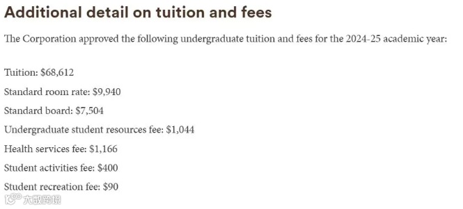 这意味着在2024-25学年,本科生总学杂费将达到87,225美元,其中学费为65,127美元,标准食宿费用为21,315美元,以及强制性健康费用为783美元。