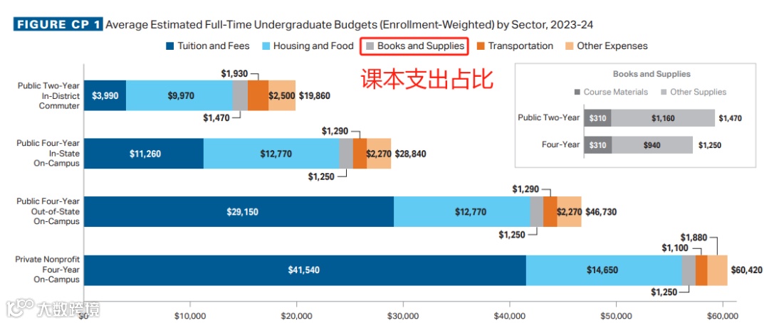 比如说大家的教科书。据统计,美国大学教科书费用近10年来上涨88%,远超学费涨幅。每年留学生们在Books and Supplies上的花费超过$1200,和租房、交通等花费排在留学生必要头部支出之一。