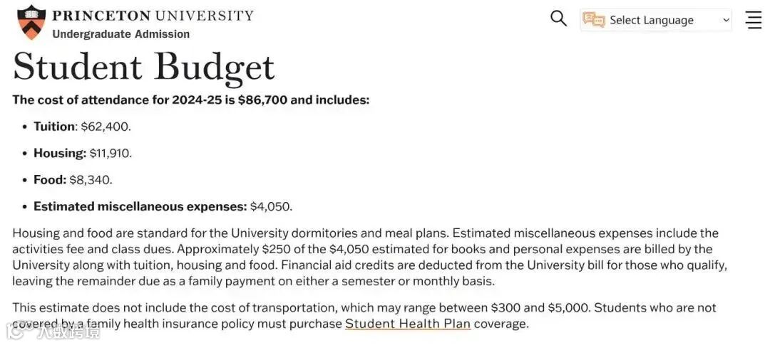 预估本学年本科生总花费为86,700美元,其中包括62,400美元的学费、11,910美元的餐费、8,340美元的住宿费和4,050的杂费,不包括交通费和保险费用。