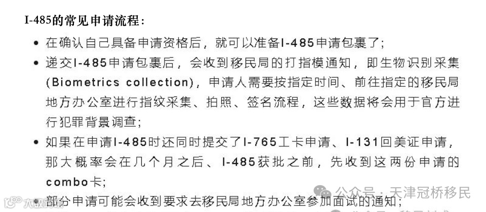 I-485,全名Application to Register Permanent Residence or Adjust Status,是只有申请人在美国境内才能使用的绿卡申请程序,在完成了之前的移民资格申请,且没有排期限制或排期已经到了的情况下,可以向移民局递交I-485身份转换申请,获批后不久就会收到绿卡。