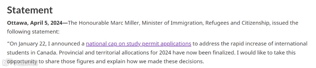 2024年4月5日——加拿大移民部长米勒(Marc Miller)在一份声明说到:
