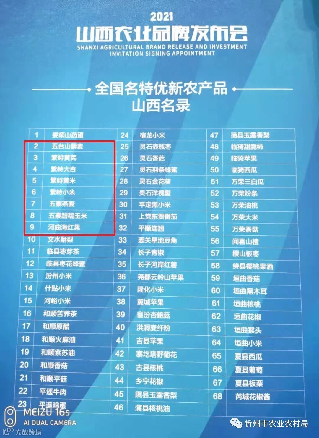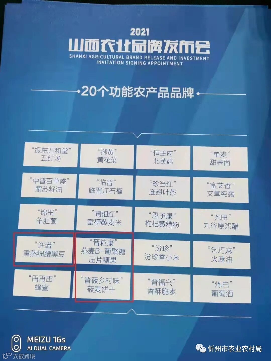 我市有繁峙黄芪、繁峙大杏、繁峙黄米、河曲海红果等8个农产品品牌入选全国名特优新农产品目录,繁峙黄米入选市域公用品牌,“晋粒康”燕麦β-葡聚糖压片糖果、“晋莜乡村味”莜麦饼干、“许诺”熏蒸细腰黑豆等3个品牌入选省级功能农产品品牌,石鼓小米、富贵老陈醋、达其爽沙棘果汁饮料、甚喜牌毛建茶、晋粒康燕麦胚芽米、林老大沙棘饮料、粮言谷香小米陈醋、玉歌糯玉米、晋襄谷缘石磨面粉等9个产品品牌入选首批山西特优农产品品牌目录。