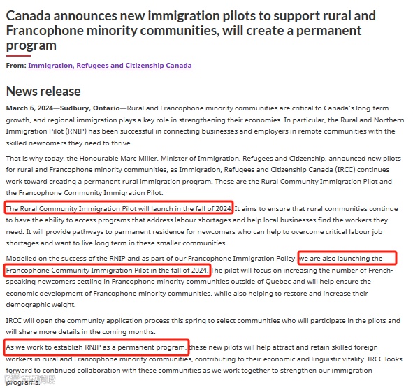 同时2024年秋季还将以 RNIP 的成功为蓝本,启动法语社区移民试点FCIP(Francophone Community Immigration Pilot),作为法语移民政策的一部分。