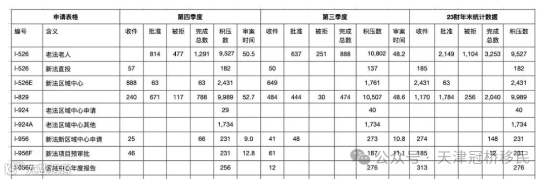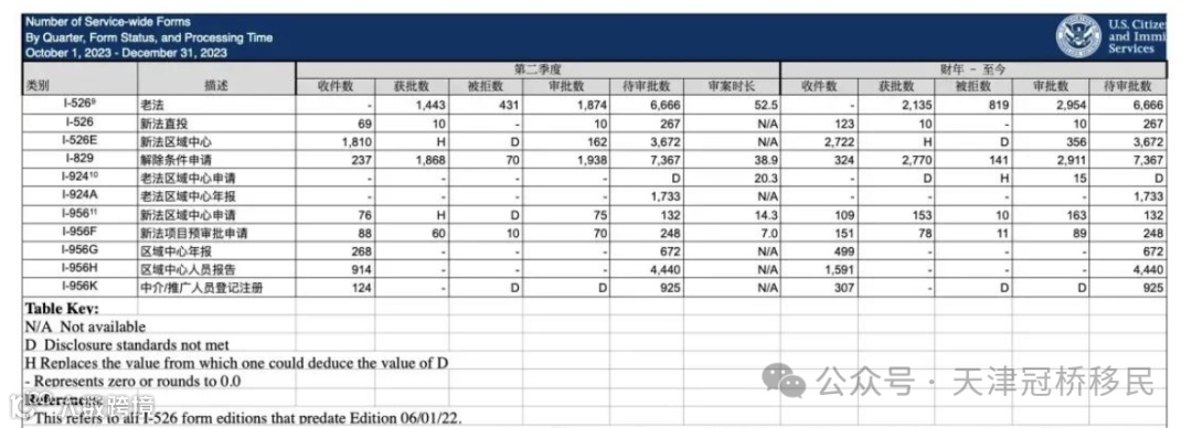 4、2023年10-12月,共32份直投I-526,581份区域中心I-526E,合计613份,平均每月204份申请;