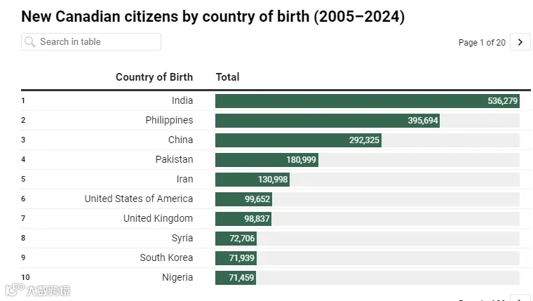 近二十年来,一些发展中国家一直是加拿大移民的主要来源,该分析统计了2005年1月至2024年5月期间按出生国统计的新加拿大公民人数。