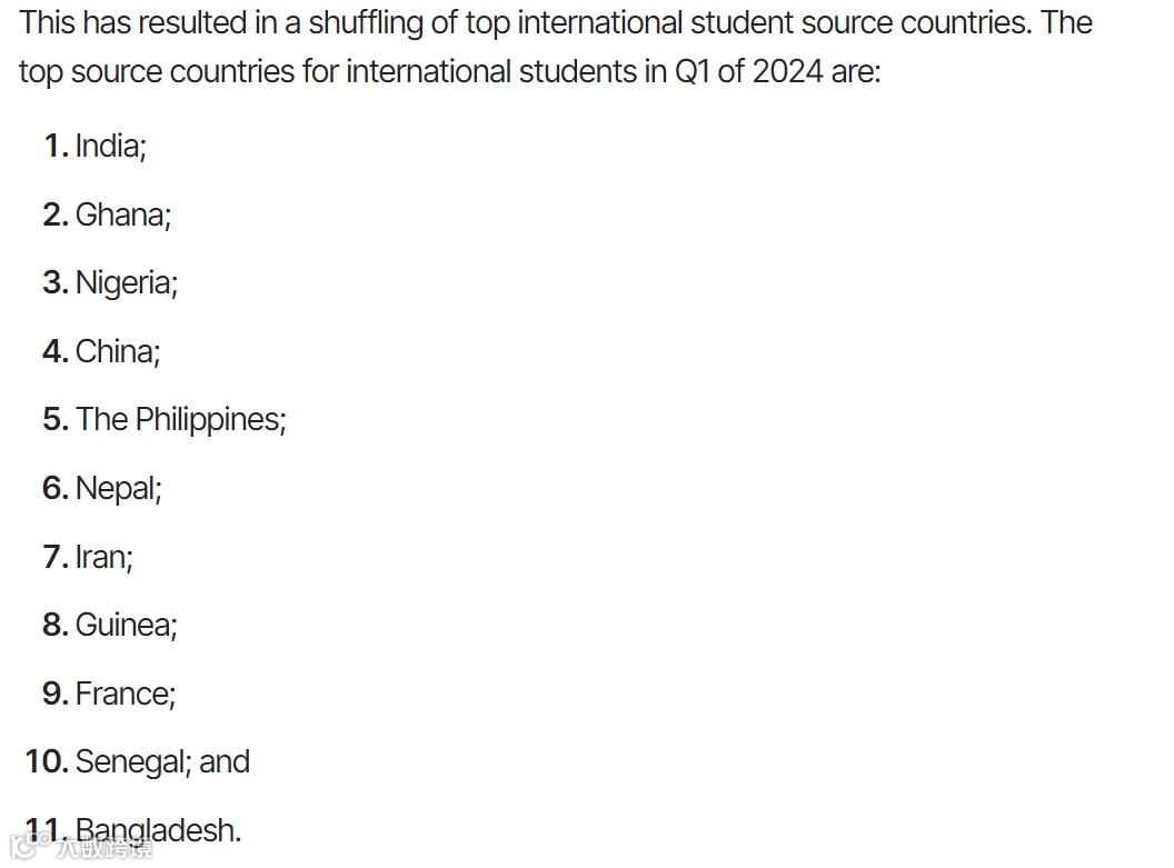 这导致了主要国际学生来源国的变动。2024 年第一季度的主要国际学生来源国如下图统计,中国排在第四位: