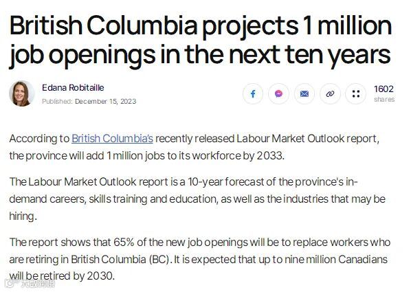 该报告显示,新增工作岗位的65%将用于填补在不列颠哥伦比亚省(BC)退休的工人。预计到2030年,将有多达900万加拿大人退休。