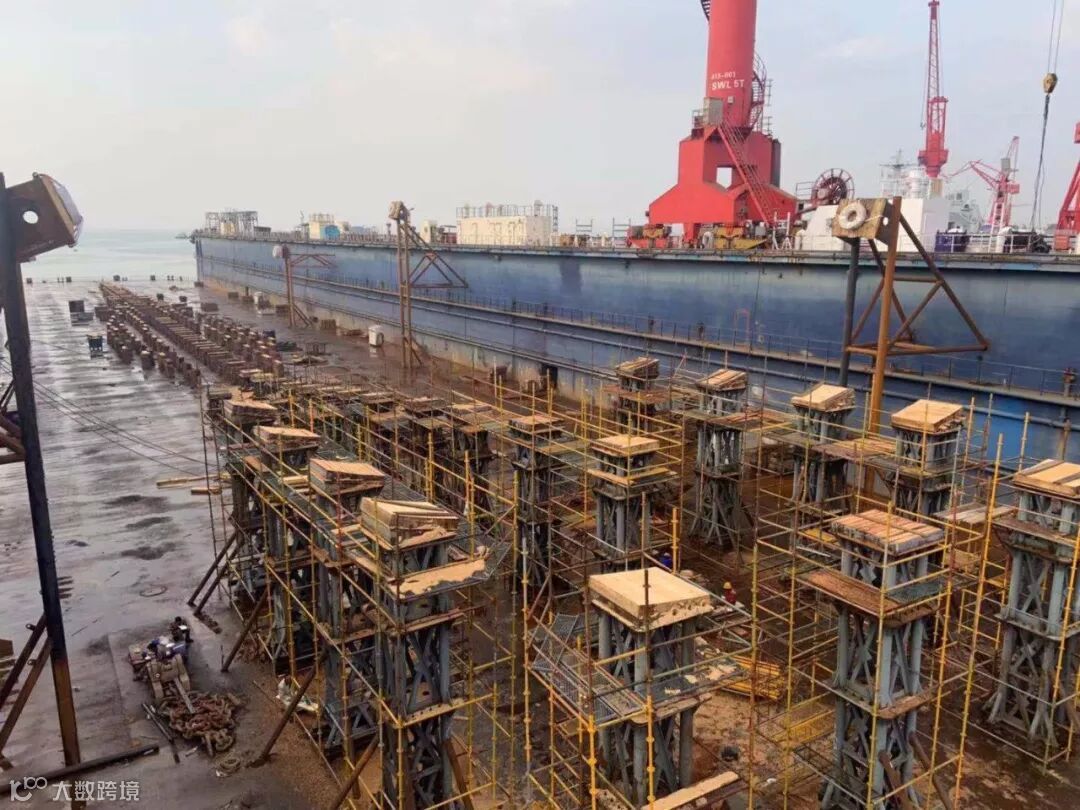 号角吹响了,技术部马上协同生产部、坞修车间反复讨论、评审安全可行的方案(包括各类工装、拖带等)。在综合考虑坞墙内净宽、全船线型无平直段、缆绳方便通过、船舶进坞及坐墩后情况变化等因素下,对船舶限位工装进行了多次探讨,前后变更了4次方案,最终达成一致意见。针对高墩报验,多方探讨合适的报验方式方法,考虑到从上而下测量墩高误差大、报验速度慢问题,他们便直接采用分段式、样板式检验方式分头获取高墩数据,提高了工作效率,减少了返工作业。