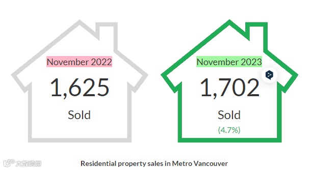 大温地产局(REBGV)报告称,2023年11月该地区的住宅销售总计1,702套,比2022年11月的1,625套相比增长了4.7%,这比十年季节性平均值(2538)低33%。