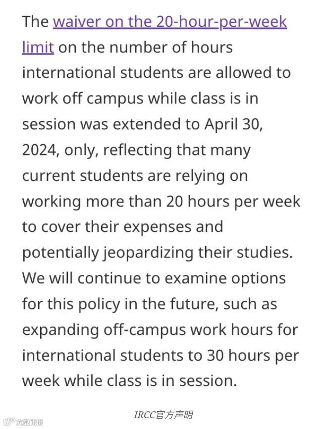 媒体新闻稿还指出,IRCC 正在寻找替代方案,并考虑将国际学生的每周工作