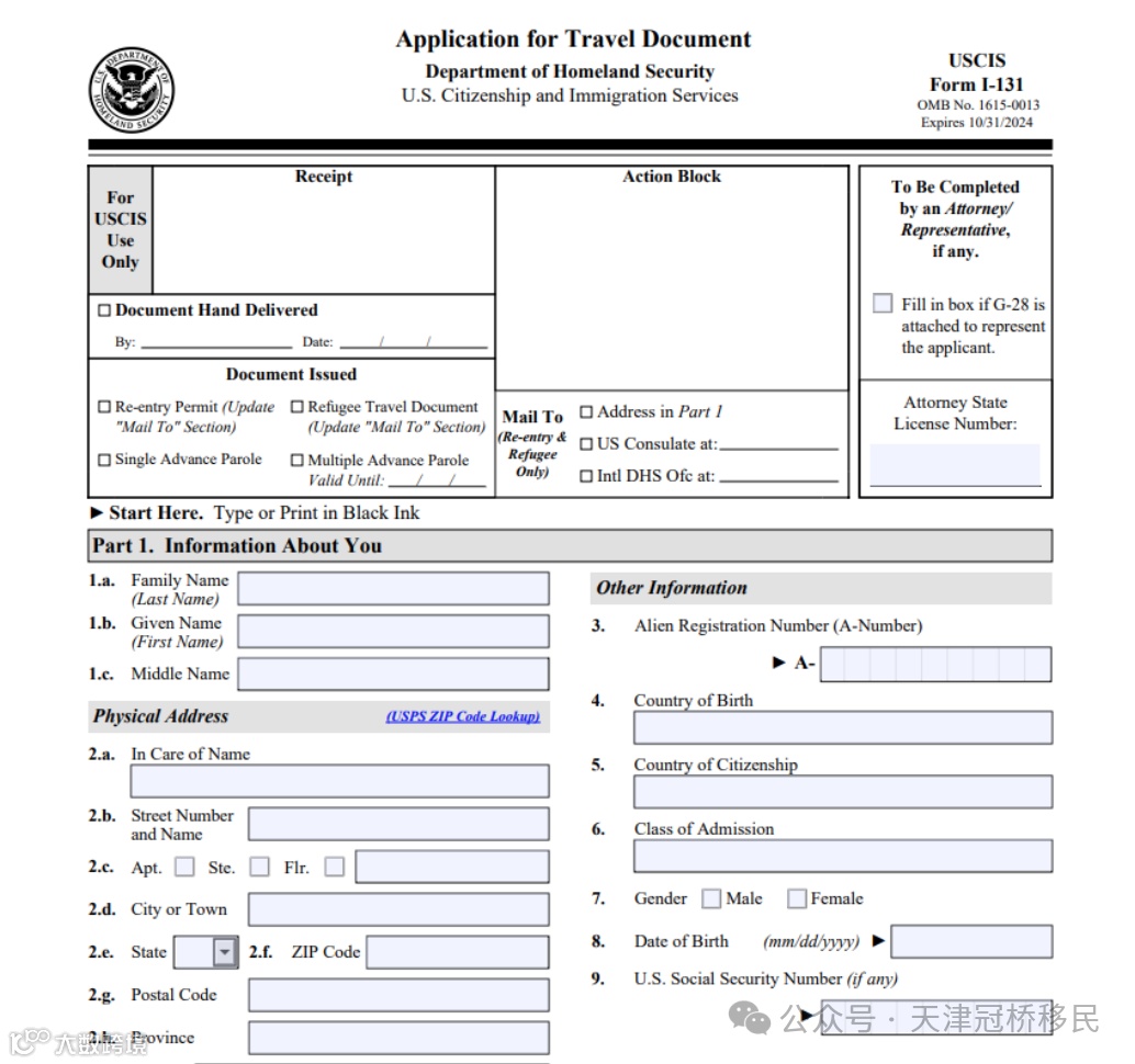 I-131表是指大多数外国人(非美国公民)必须在出国旅行前向美国移民局USCIS提交的I-131旅行证件申请表(application travel document)。此旅行证件通常由绿卡持有人使用。