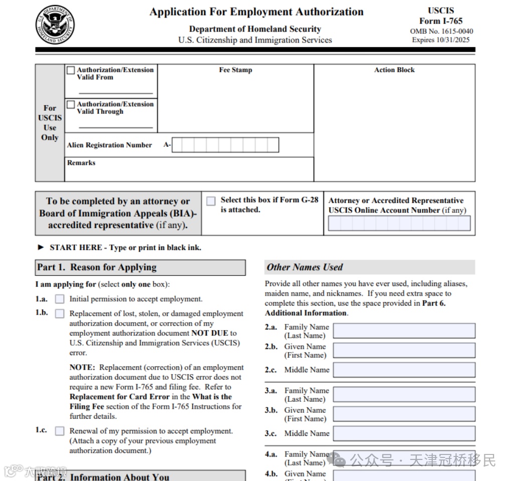 I-765是一种表格,用于由外国人填写申请就业授权。这个表格也被称为就业授权申请表。