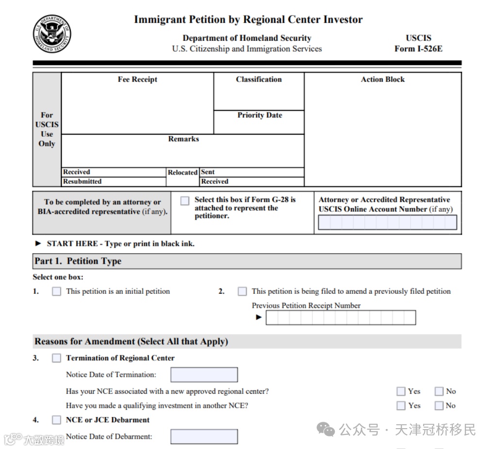 根据《移民和国籍法》(INA),一名或多名参与区域中心计划的合格移民共同投资的投资者使用I-526E表格向美国移民局申请移民身份。如果投资者投资的区域中心、新商业企业或创造就业的实体被终止或被禁止参与区域中心,区域中心投资者也可以使用I-526E表格报告任何必要的修改,以保证资格的持续性。