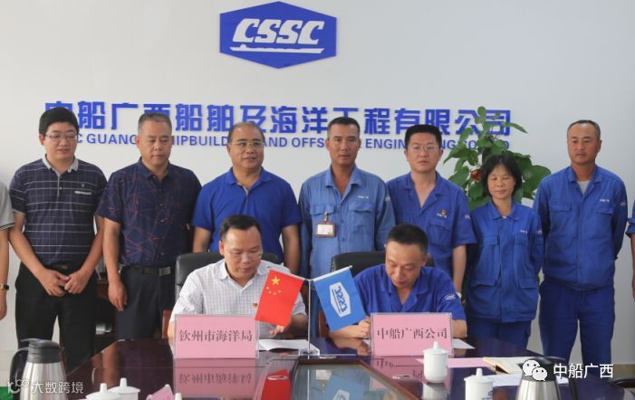 5月11日上午,中船广西公司与钦州市海洋局在中船钦州基地举行签约仪式,双方签署了战略合作协议。钦州市海洋局局长李远钦、副局长李秀东、党组成员杨炳宏,中国海监钦州市支队副政委陈福义,钦州市海洋局港区分局局长何启林,中船广西公司副总经理谈卫和相关部门负责人参与了仪式。