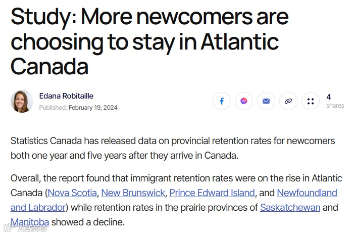 报告发现,大西洋省份(新斯科舍省 NS、新不伦瑞克省 NB、爱德华王子岛 PEI以及纽芬兰和拉布拉多省 NL)的移民保留率呈上升趋势,而萨省和曼省等草原省份的移民保留率则呈下降趋势。