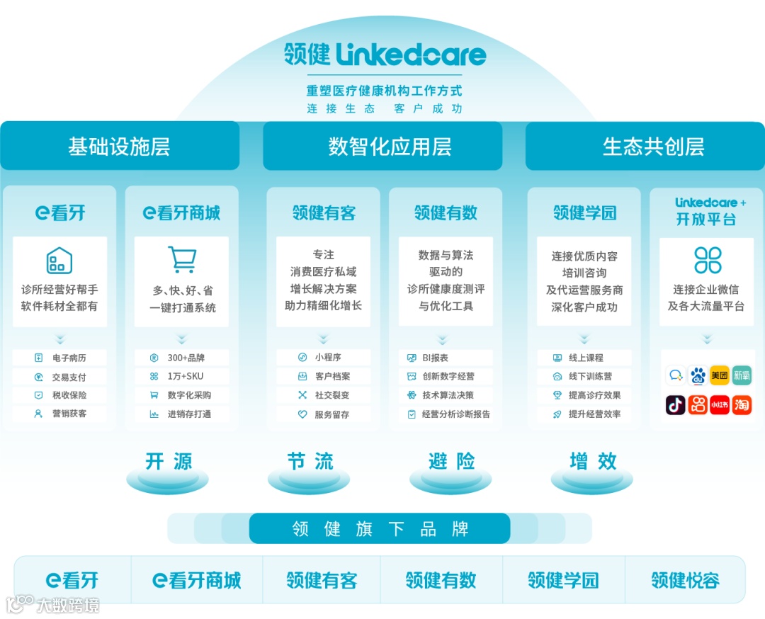 Linkedcare领健,为口腔、医美、生美等机构提供经营一体化解决方案,即提供了覆盖单店连锁管理、健康档案、客户管理、智能营销、交易平台、库房管理、保险支付、影像集成、商业智能等,覆盖机构业务全流程的一体化SaaS软件。同时通过开放平台连接产业上下游,与优质的第三方机构合作,为机构提供完整配套的一站式服务。
