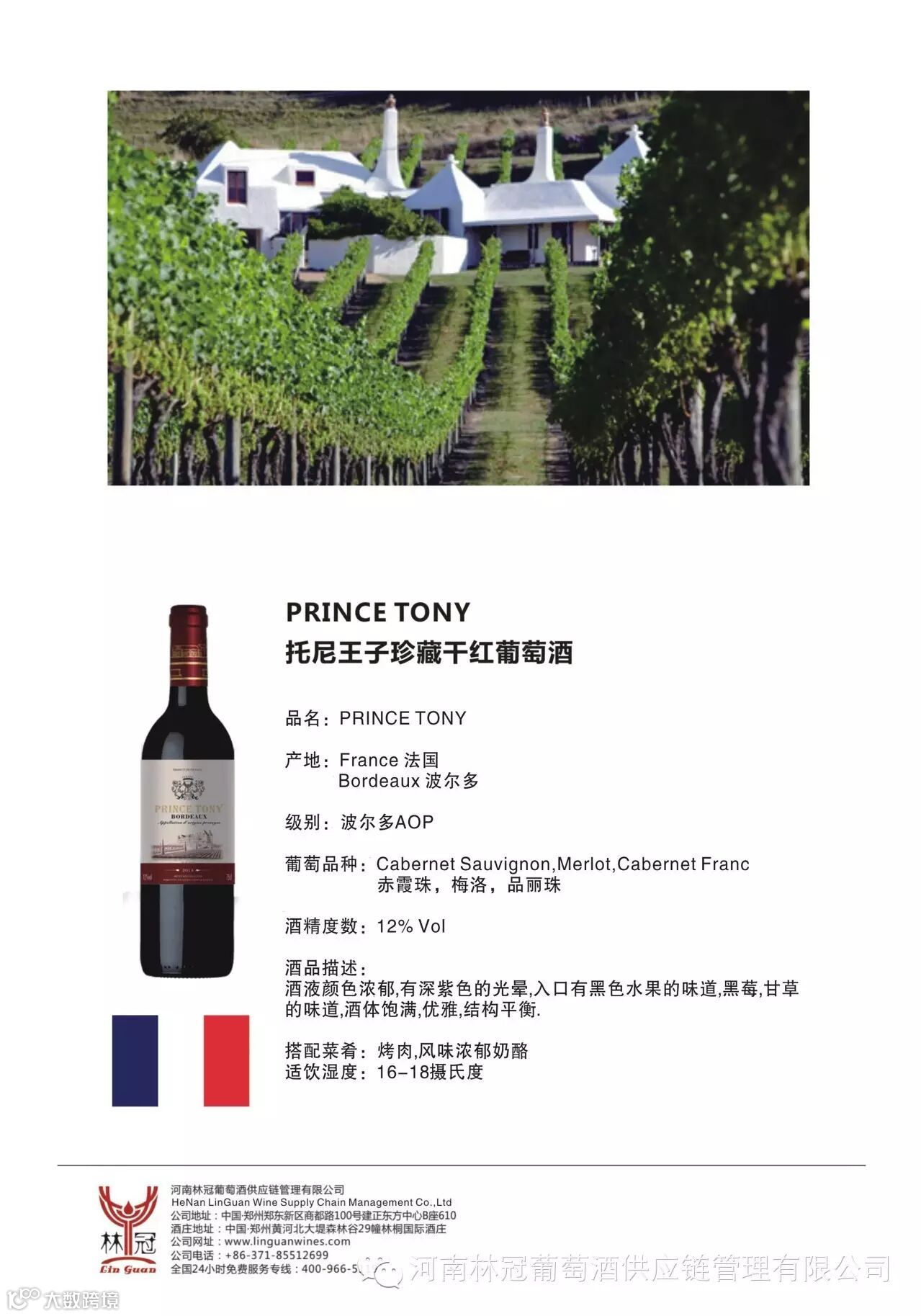 河南林冠葡萄酒供应链管理有限公司的托尼王子珍藏干红葡萄酒就是一款波尔多法定产区的葡萄酒,品质纯正,性价比高,原瓶进口。欢迎朋友们来林冠葡萄酒公司品尝这款来自波尔多的葡萄酒!