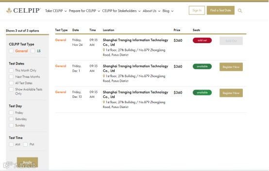 接下来,需要选择一个能够方便你前往考点的测试中心(上海的就选上海就行),最后缴纳相关费用。