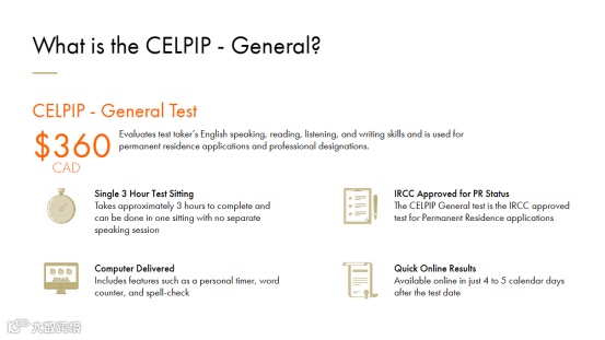 评估考生的英语听、说、读、写四项能力,考试时间三个小时,是加拿大移民、难民和公民身份局 (IRCC) 正式指定用于永久居民申请的考试,也可用于专业指定考试。