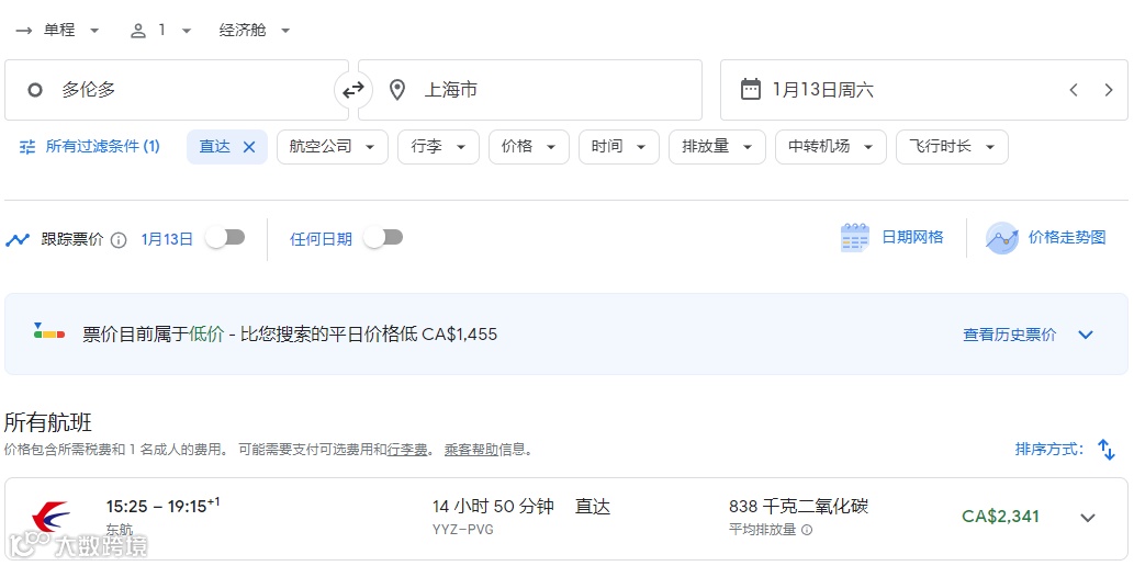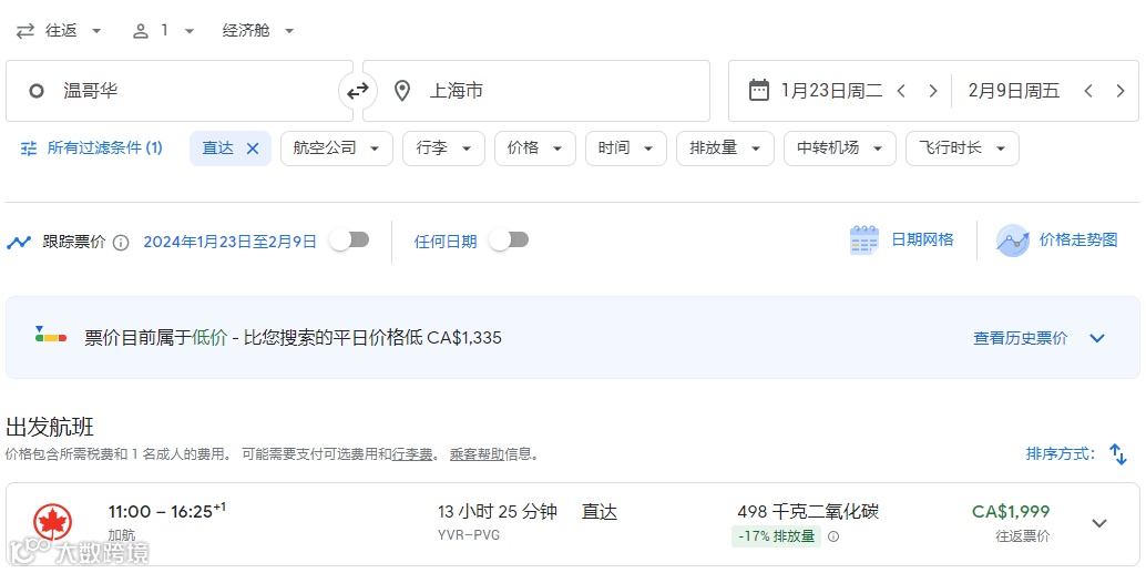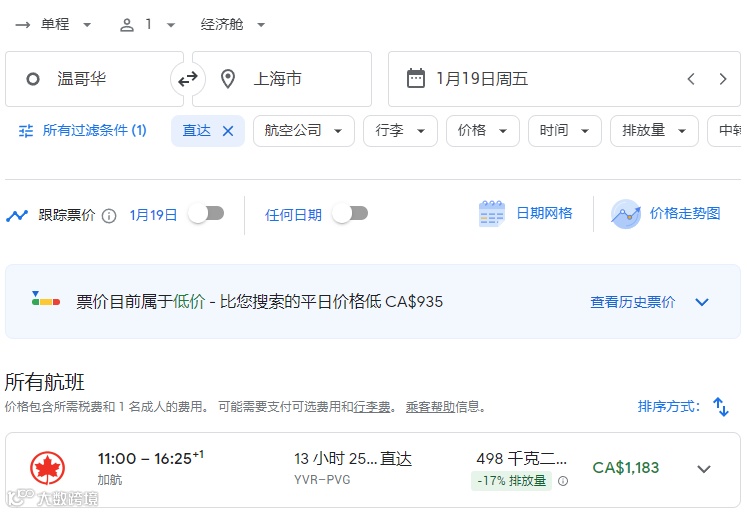 除了这个航线外,根据Google Flight数据,温哥华-上海同期单程票价为$1183。