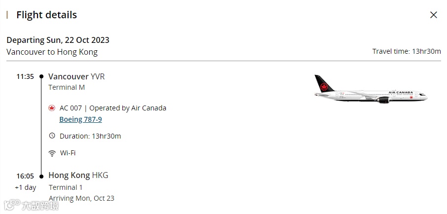 根据加拿大航空公司官网消息,目前的航班情况是每天一班,温哥华当地时间11:35起飞,香港当地时间16:05落地,全程13.5小时,执飞机型为波音787-9。