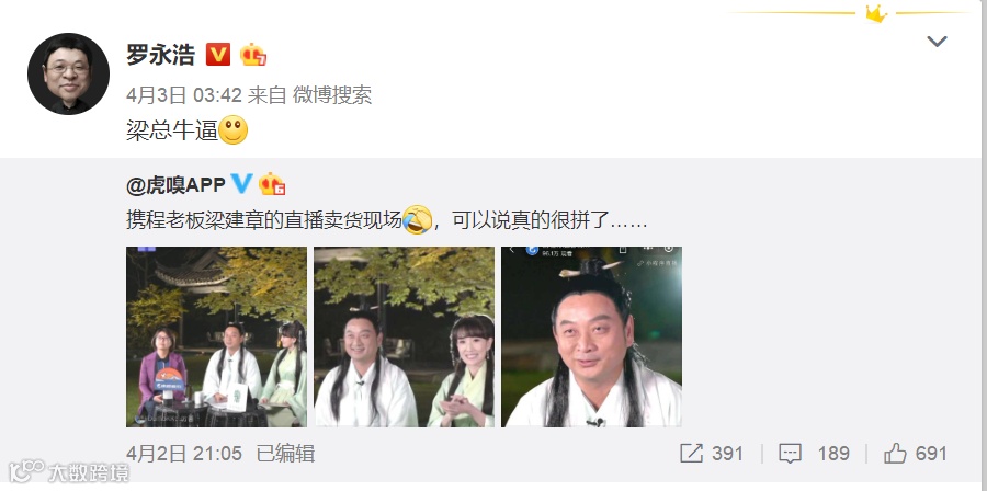 紧跟罗永浩脚步的是携程创始人梁建章,4月2日,他以一身略微辣眼的古装打扮亮相直播间,以4折预售湖州高星酒店,一小时内,创造了2691万GMV。