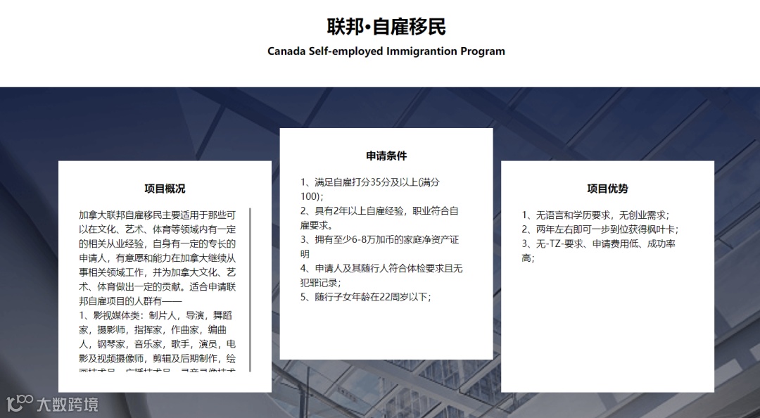 自雇移民是指通过自己的创业项目获得加拿大永久居留权。申请人需要证明自己在过去两年内有至少两年的自主经营经验,并且自己的职业属于文化、艺术、体育、旅游等领域。