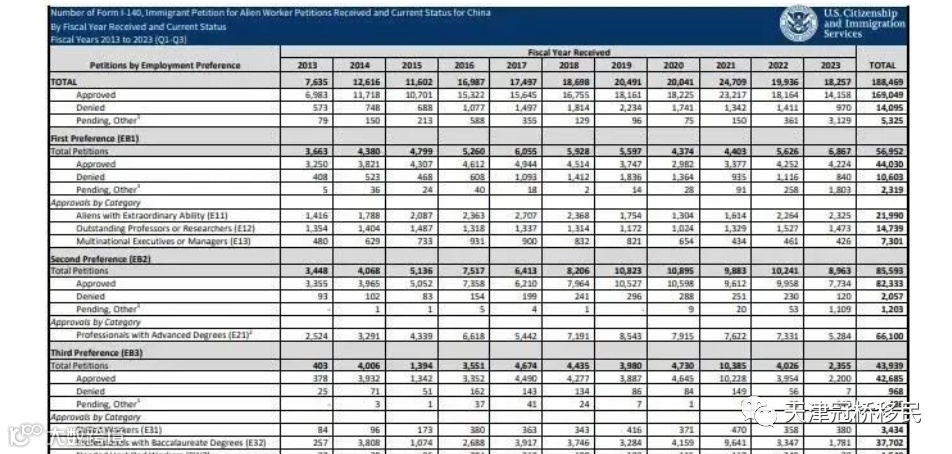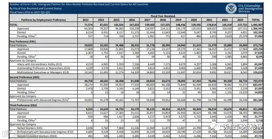 日前,美国移民局公布了2023财年前三季度的I-140审理情况。