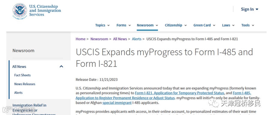 近日,美国移民局官网发布了一则消息。myProgress(我的进程)的查询功能将扩展到I-821表(临时保护身份申请)和I-485表(登记永久居留或调整身份申请)。