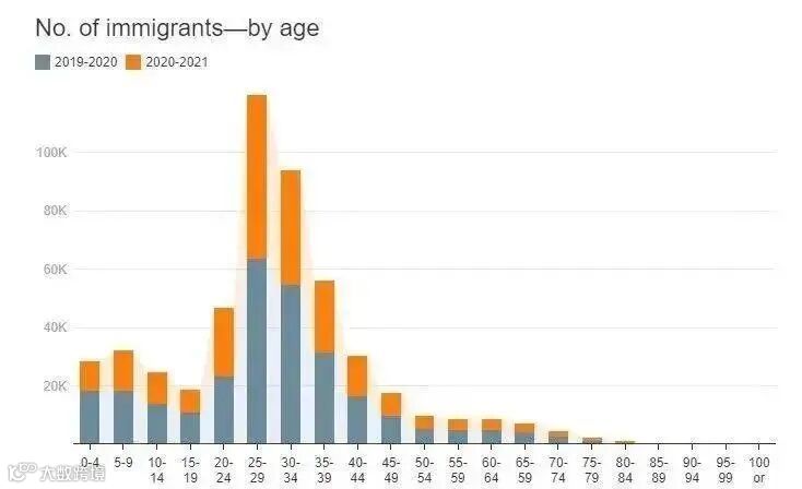 1.20岁到39岁的青年人,显然是加拿大移民的主力军。仅25~29岁年龄段,近两年总移民人数就接近12万人,年均6万人,比40岁以上的年龄段加起来还要多。